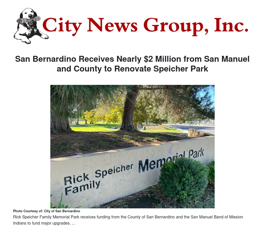 The City of San Bernardino has announced nearly $2 million in grants from the County of San Bernardino and the San Manuel Band of Mission Indians to fund major upgrades to Rick Speicher Family Memorial Park.