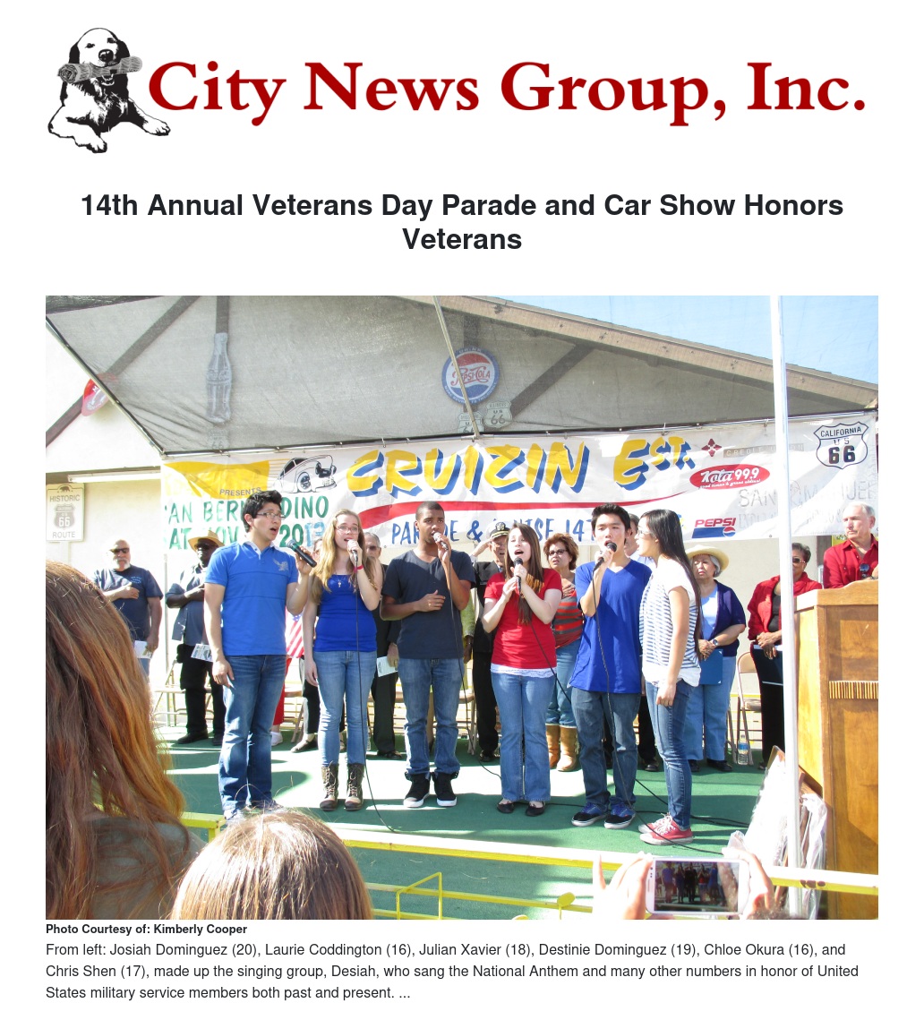 Singing a military medley which consisted of all of the military branches songs which represents them, Desiah, a teen singing group, asked that each veteran stand for recognition upon hearing their military branch announced. Desiah sang "God Bless America" while attendees faced the flying American flag, right hands over their hearts.