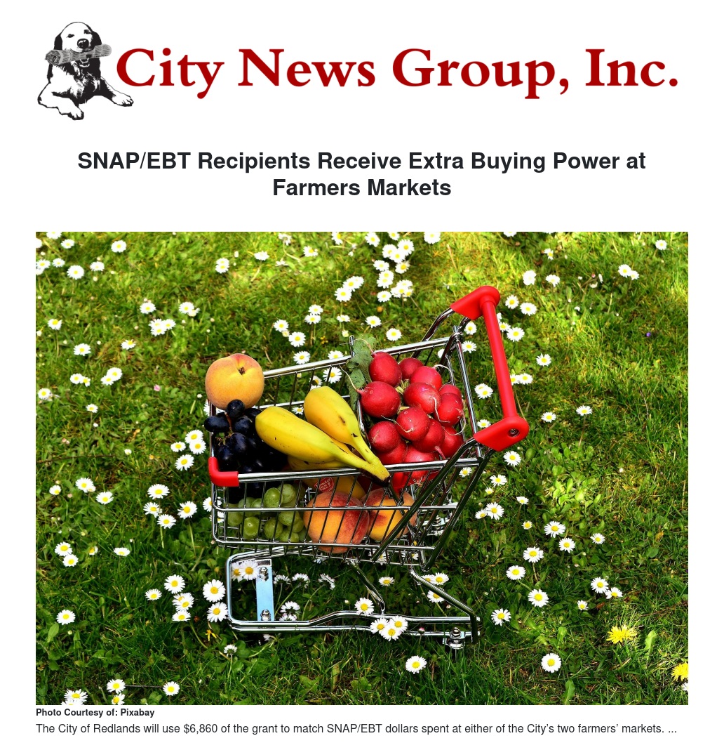 REDLANDS>> The City of Redlands Quality of Life Department was recently awarded a $15,110 grant from the United States Department of Agriculture that includes funding aimed at offering low-income shoppers extra buying power when they spend their Supplemental Nutrition Assistance Program (SNAP) benefits on California-grown fruits and vegetables at certified farmers’ markets.