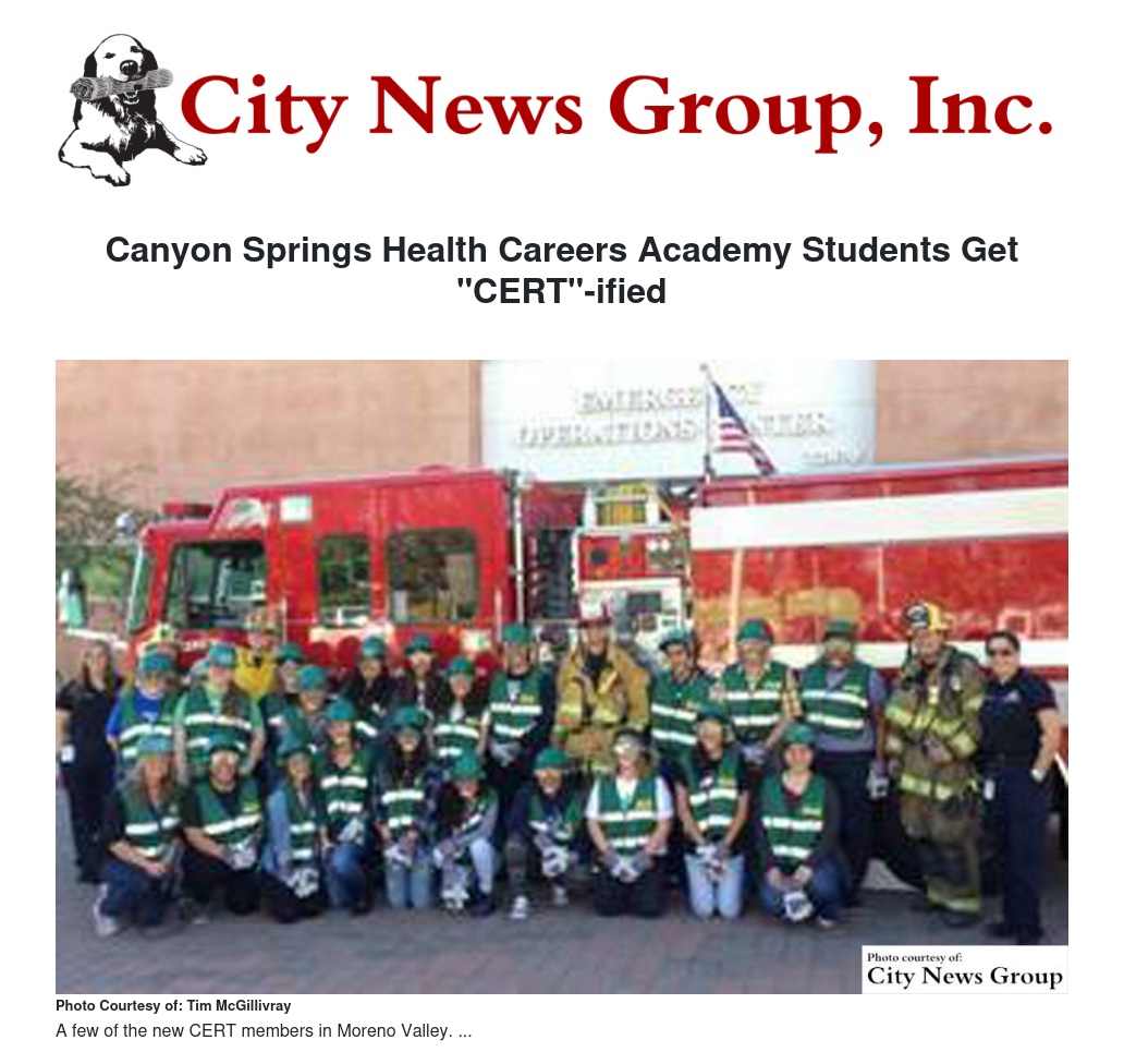 The Moreno Valley community can rest just a little bit easier now that 12 members of the Canyon Springs Health Careers Academy have completed a weekend of Community Emergency Response Team (CERT) training. The national CERT program educates people about disaster preparedness for hazards that may affect their community, and trains them in basic disaster - response skills, such as fire safety, light search and rescue, team organization and disaster medical operations.