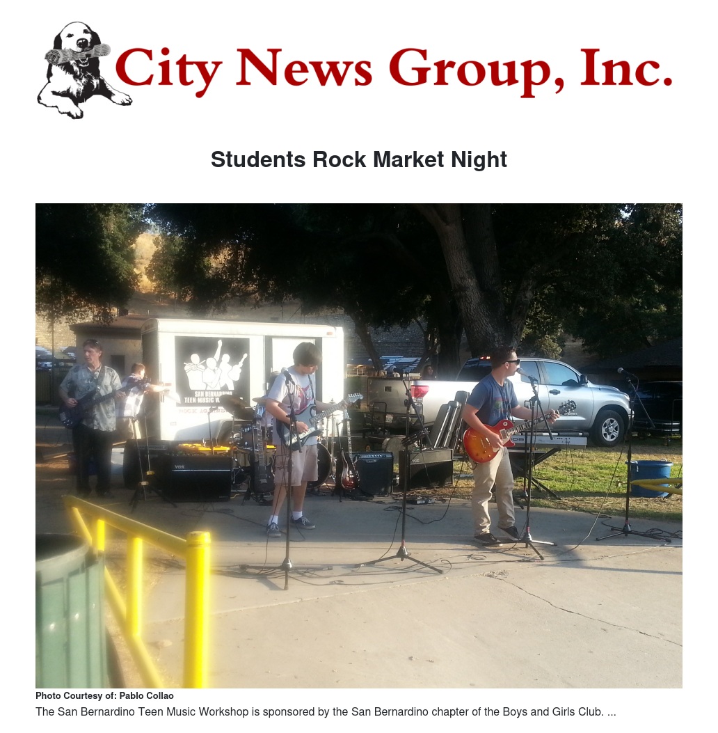 The outdoor concert by the San Bernardino Teen Music Workshop is sponsored by the San Bernardino chapter of the Boy’s and Girl’s Club, and provides students with this after school alternative program as an effort to give local students musical instruction and direction while they play drums, guitar or step up to the microphone and sing.