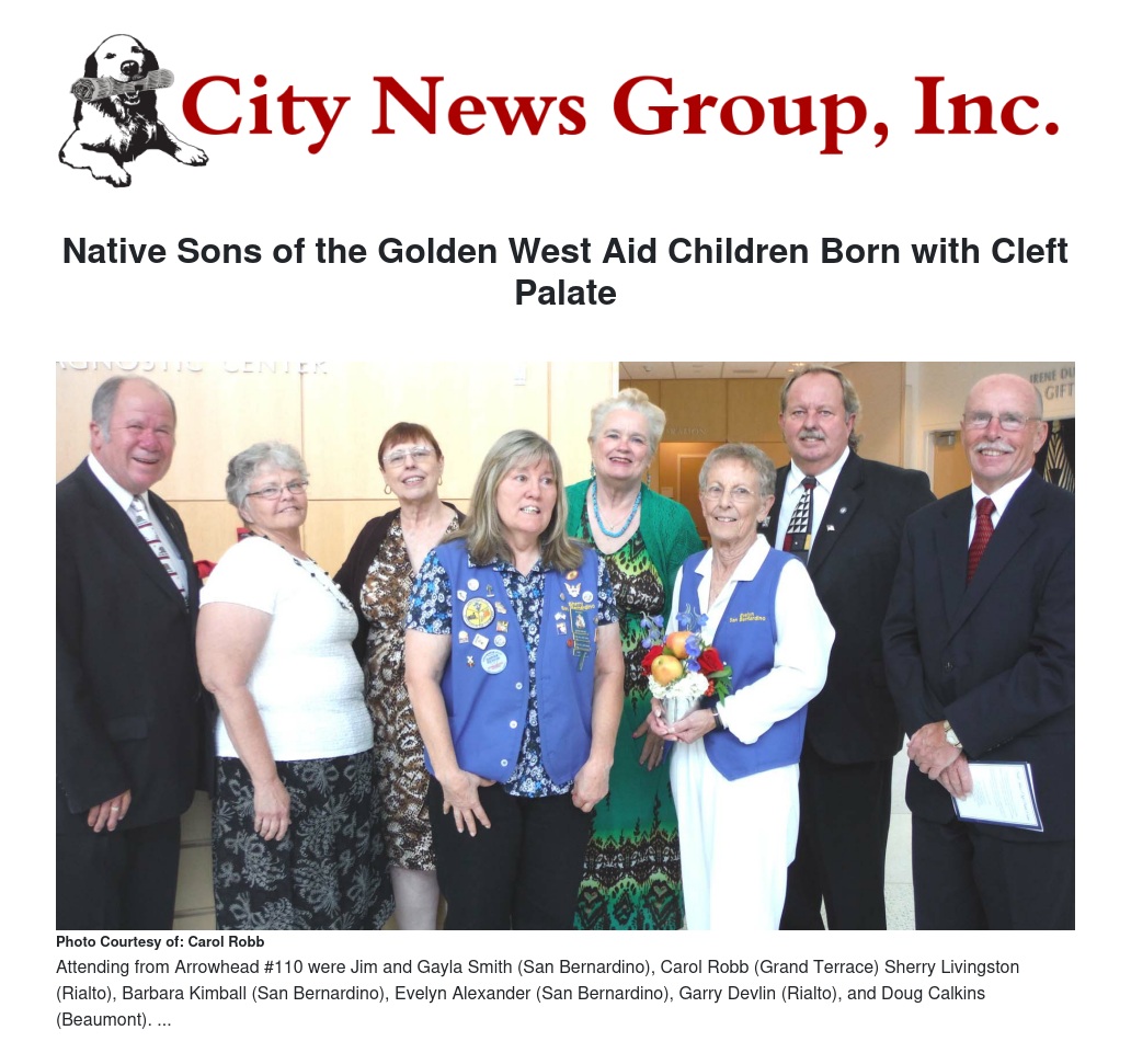 Members of San Bernardino’s Arrowhead Parlor #110 of the Native Sons of the Golden West joined statewide officers and others who presented a check for $55,000 to St. John’s Hospital in Santa Monica on Aug. 4 for research and treatment of children born with cleft palate and other craniofacial anomalies.