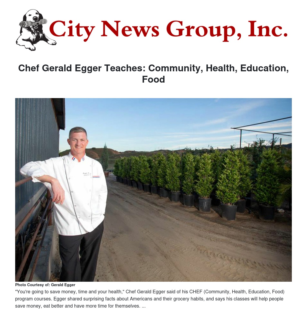 The Loma Linda Chamber of Commerce recently welcomed Chef Gerald Egger as the presenter of a morning breakfast networking meeting where he outlined the three proponents of his CHEF (Community, Health, Education, Food) courses and revealed surprising facts about American weekly food consumption.