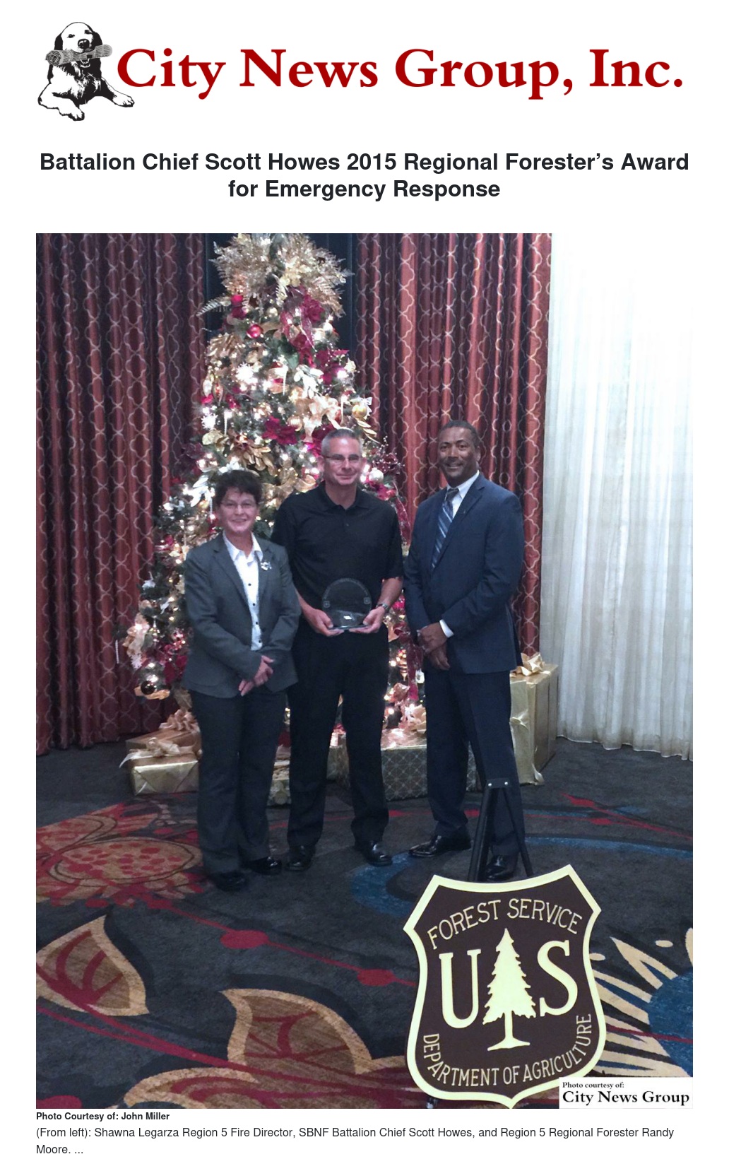US Forest Service Fire Battalion Chief Scott Howes is the 2015 recipient of Pacific Southwest Regional Forester’s “Safety Leadership in Emergency Response” award for his role as Incident Commander on the North Fire in Cajon Pass.