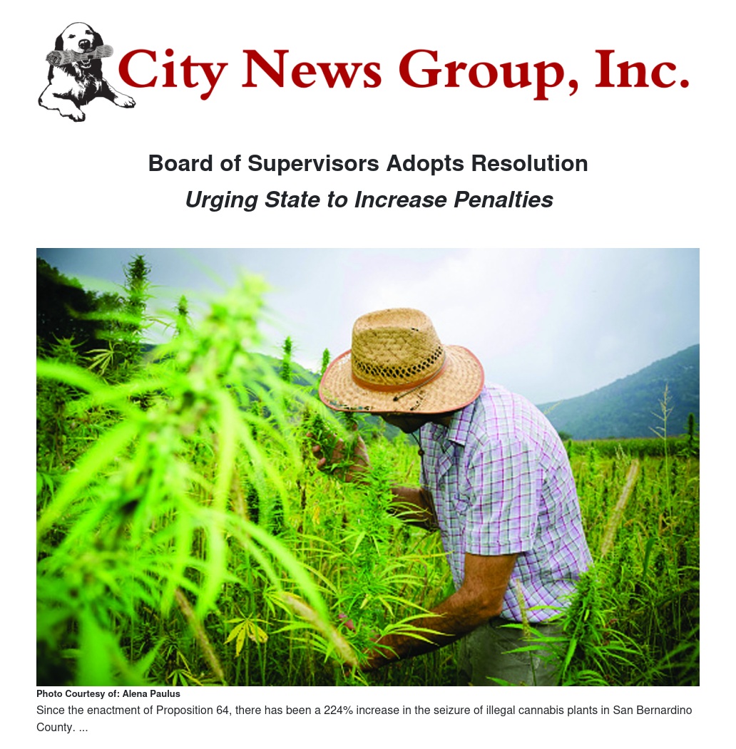 Since the enactment of Proposition 64, there has been a 224% increase in the seizure of illegal cannabis plants in San Bernardino County. In total, the San Bernardino Sheriff’s Department believes there are 861 illegal cannabis farms operating throughout the county.