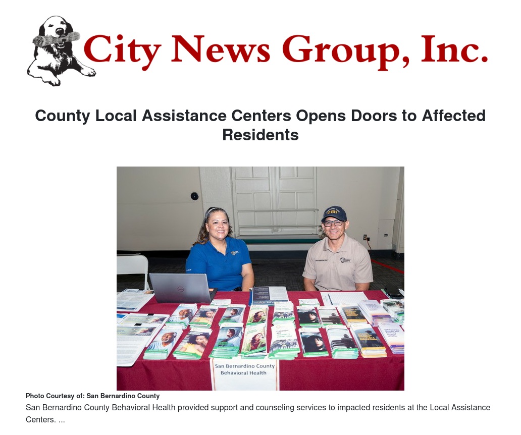 San Bernardino County Behavioral Health provided emotional health support and counseling services to impacted residents at the Local Assistance Centers.
