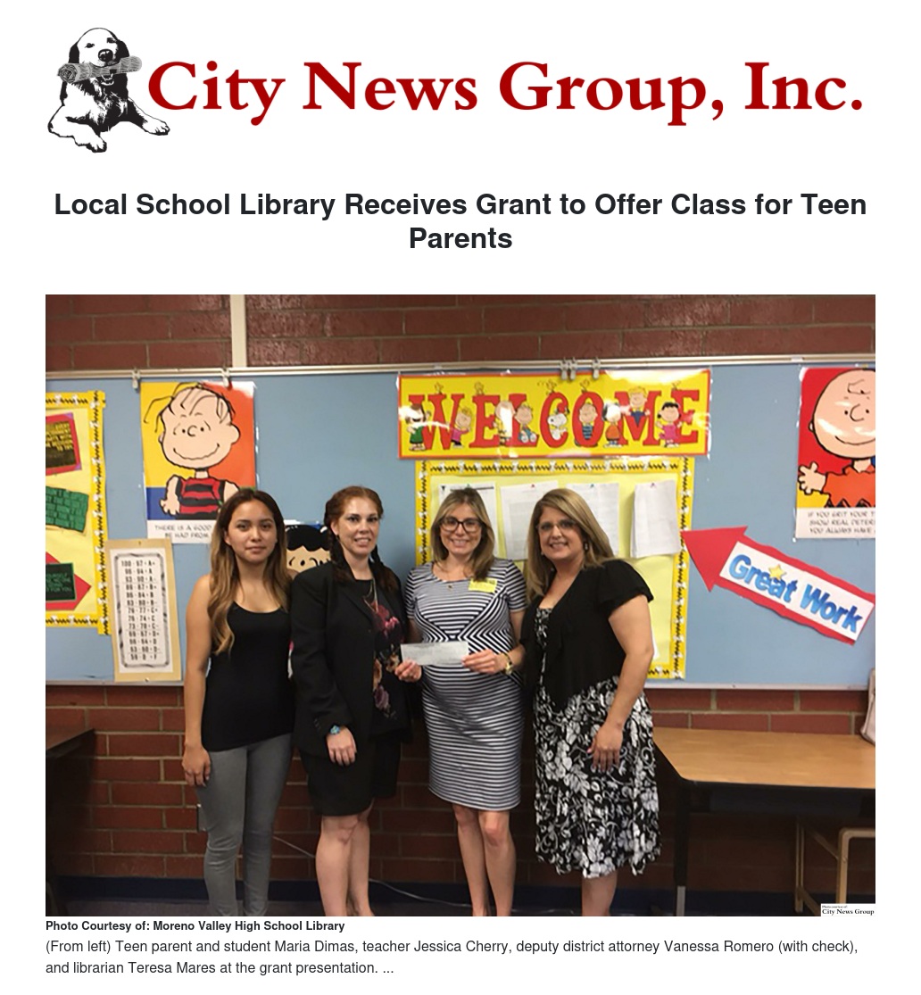 RIVERSIDE >> The Riverside County Deputy District Attorney Association (RCDDAA) recently selected and awarded Moreno Valley High School (MVHS) Library a Community Grant, giving the Library $500 to purchase childhood development books and offer a class in the fall focused on teen parenting.