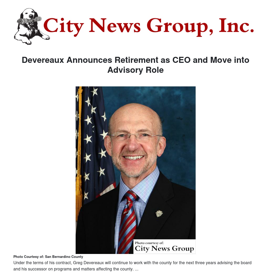 SAN BERNARDINO>> After nearly 40 years in public service, 25 of those years in the Inland Empire, Greg Devereaux announced he will retire from his role as San Bernardino County Chief Executive Officer by the end of the current fiscal year.