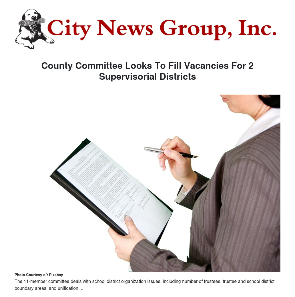 The San Bernardino County Committee on School District Organization is seeking applicants to fill two vacant seats for appointment to unexpired terms, one in the Second Supervisorial District and the other in the Fourth Supervisorial District.