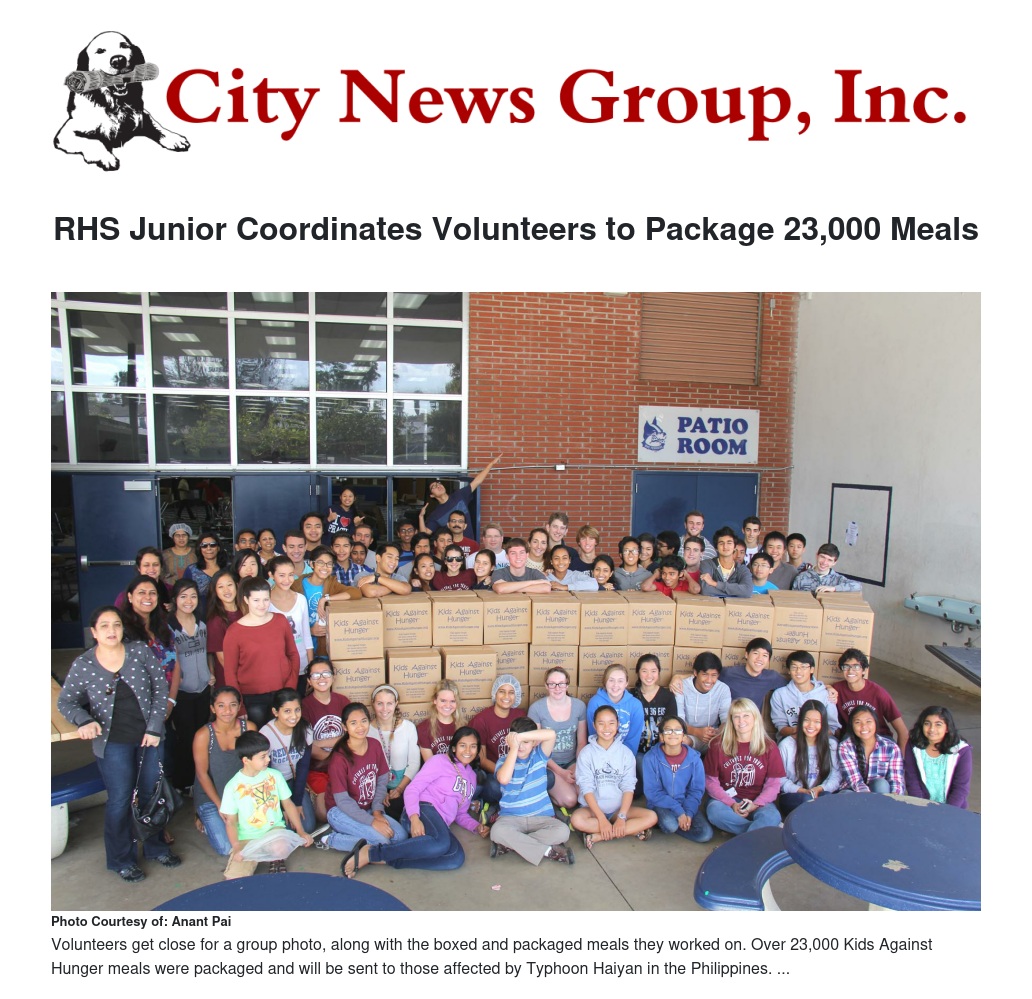 Through a friend, Pai learned of Kids for Hunger, a sub-group of the Fundraising with a Purpose organization headed by Director BJ Stavness, and Pai began his fundraising efforts. By the end of the summer, he’d collected $2,500, which he donated to Fundraising with a Purpose to purchase meals for Kids Against Hunger, a national humanitarian food-aid organization that works to end world hunger by donating meals to over 60 countries worldwide.