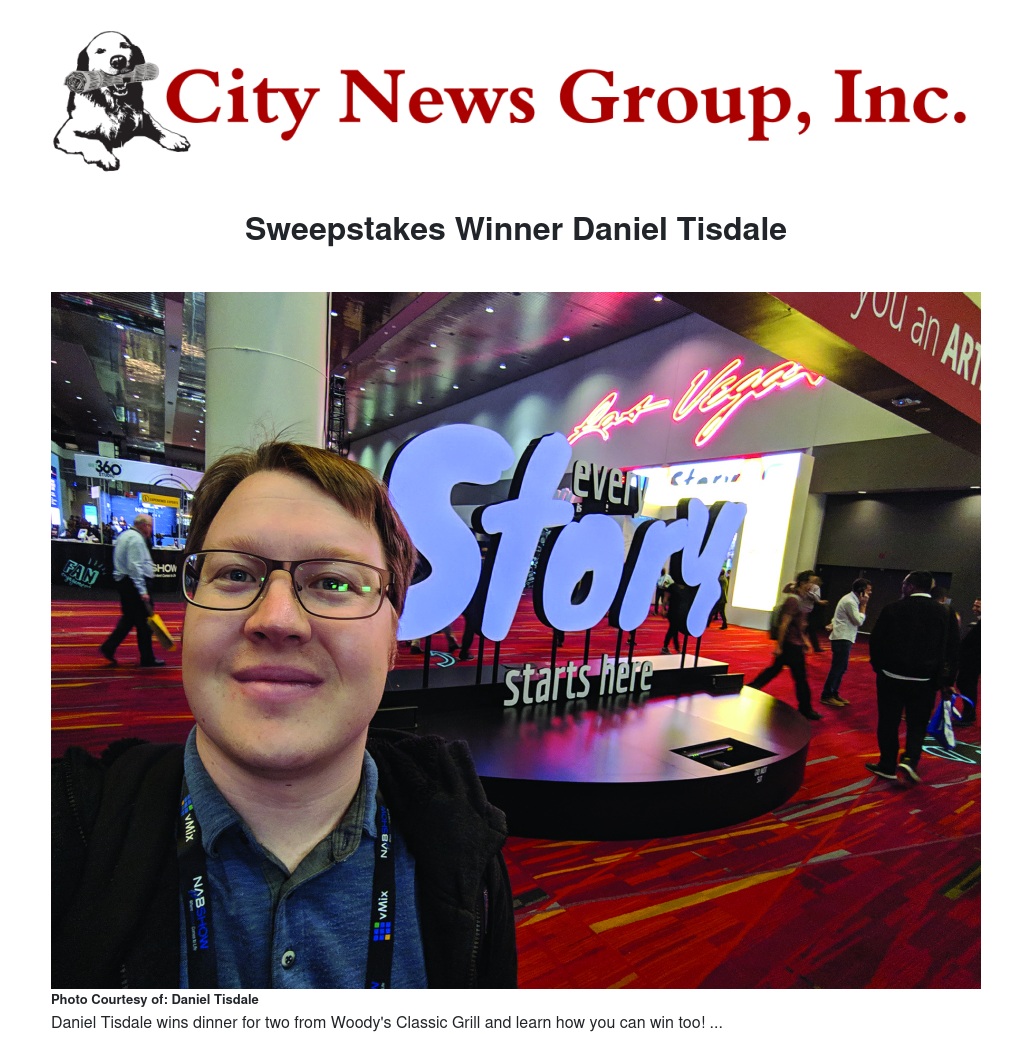 Although, he didn't win the $1,000, he is still eligible! Daniel Tisdale, resident of Colton is one of the City News Group Inc. Sweepstakes’ weekly winners, earning himself a free meal from Woody’s Classic Grill.