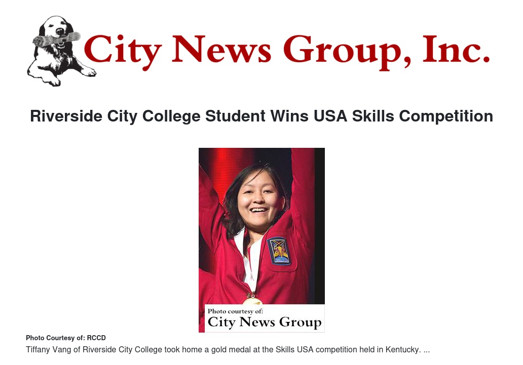 Riverside City College student Tiffany Vang won the print industry’s equivalent of the Triple Crown when she won a gold medal in Graphics Communications at the Skills USA competition in Kentucky, completing a sweep of the regional, state and national competitions in that category.