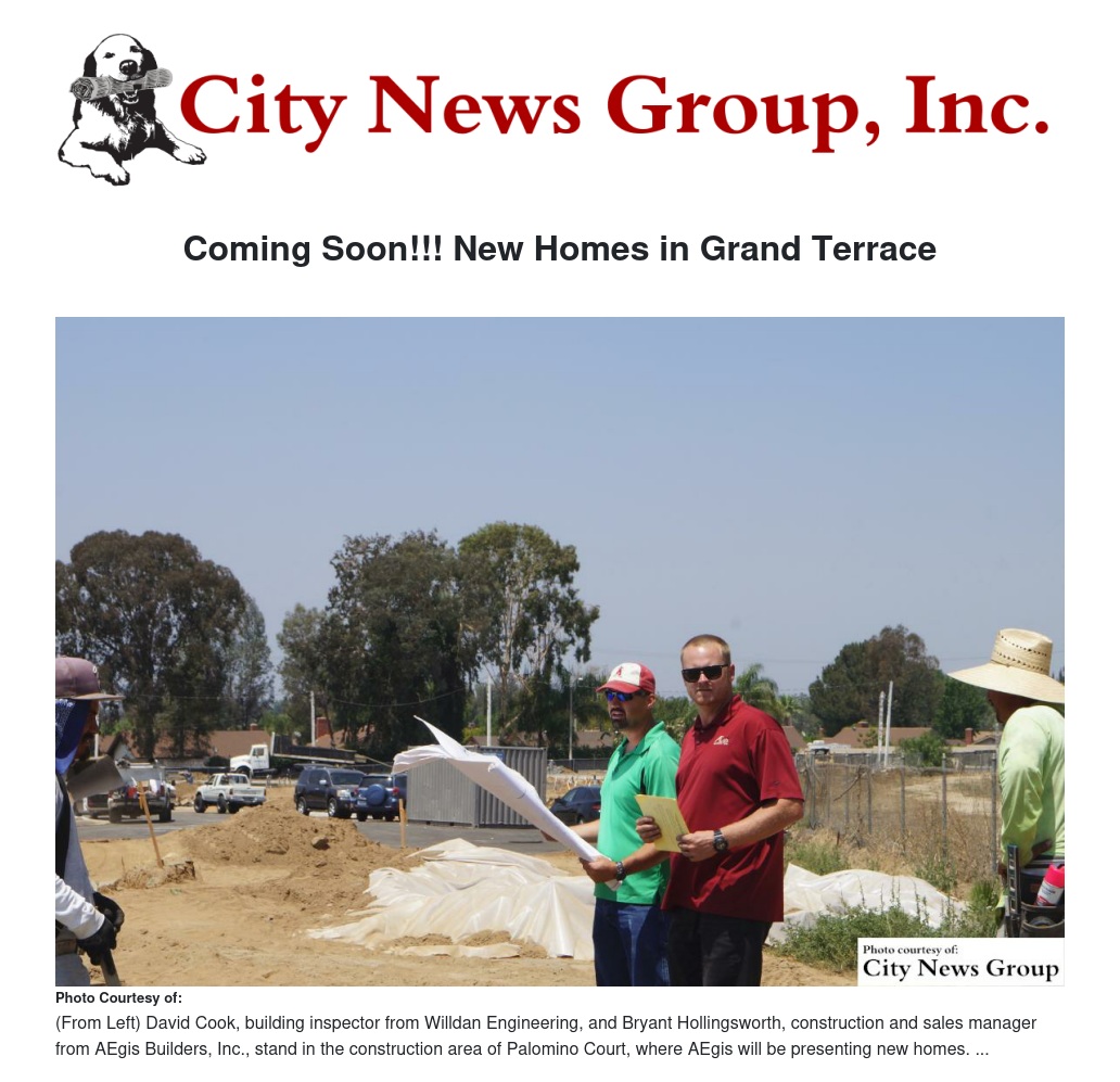 Future residents of Grand Terrace will have an opportunity to settle down in a brand new community developed by AEgis Builders, Inc. with homes on Palomino Court in the city of Grand Terrace. “It’s an amazing community to live in and start a family,” said Bryant Hollingsworth, construction and sales manager. “Great schools aren’t the only attractions to Grand Terrace. It [also] boasts one of the lowest crime rates in Southern California.” According to Hollingsworth, there are six single-story homes and six two-story homes available for sale right now. “These homes will be available for occupancy in October, construction is on schedule,” he said. At this point in time, buyers will have the extreme advantage of the numerous choices to make this home their own. “They will be able to choose the Finish Standards such as cabinets, tile, granite and more,” Hollingsworth revealed. The principals of AEgis Builders, Inc. individually have more than 30 years’ experience in project planning, entitlement, project management and construction, dealing with a wide variety of product types including commercial, retail, industrial and large custom and residential tract projects. Darryl E. Moore, vice president and broker, has lived in Grand Terrace since 1970 and constructed townhouses on Preston Street through AEgis Builders, Inc. “These homes are pre-plumbed for solar,” Moore added. “They’re going to have tall ceilings, lots of space, energy efficient, nice finishes and beautiful yards.” Moore and Hollingsworth make a dynamic duo in building these homes for the Grand Terrace community. “Bryant is quite a young man,” Moore said. “He’s very focused on the work we do in building these tracts and marketing them. It’s very challenging work, so we have to be very focused to get the job done.” Moore said they like Grand Terrace, which attributed to their choice of location. “Grand Terrace needs housing, and we think we understand the market here and what it needs,” Moore said. Grand Opening day is June 25, 10 a.m. to 2 p.m. The celebration includes food, fun and fabulous prizes. To find out more information regarding AEgis Builders, Inc. or their new homes, call the office at (909) 825-8022, or check out their website at http://www.aegisbuildersinc.com.