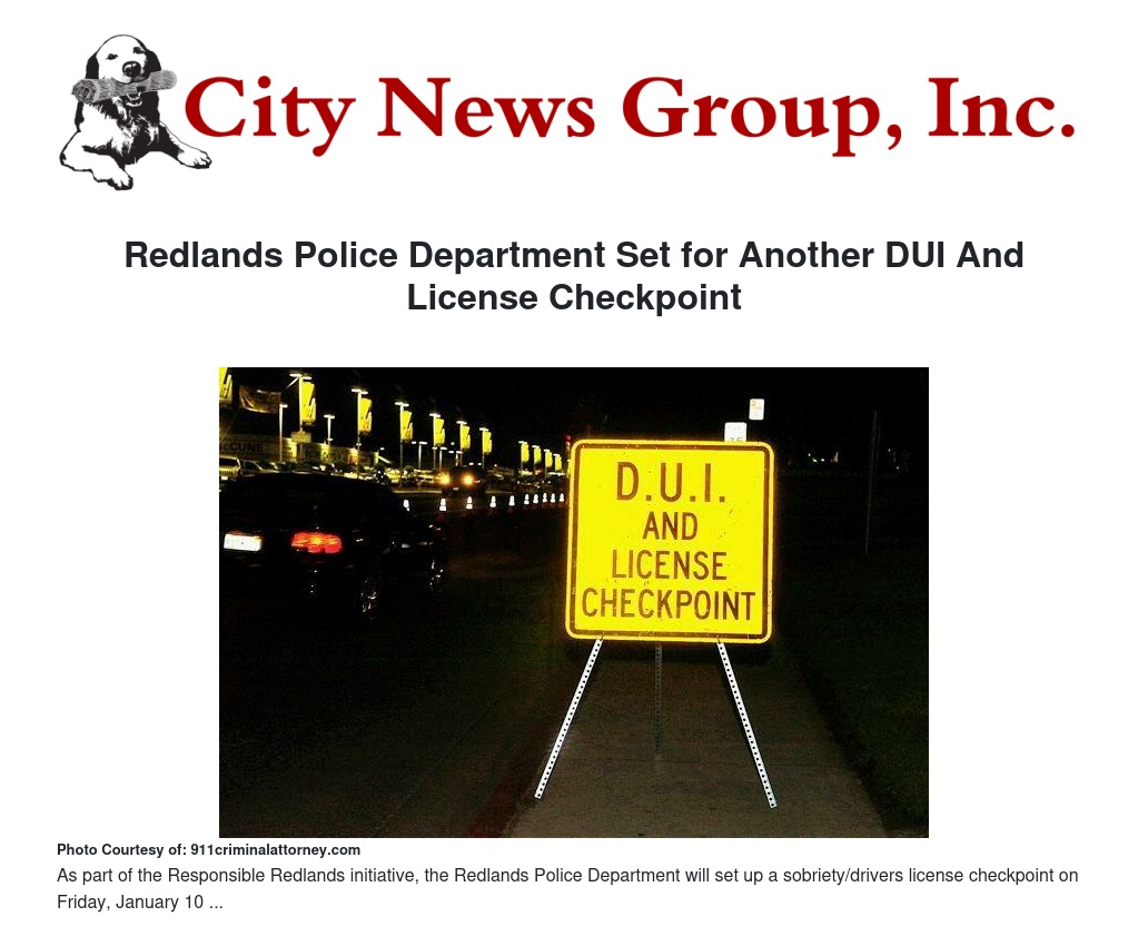 Redlands Police Department Set for Another DUI And License Checkpoint