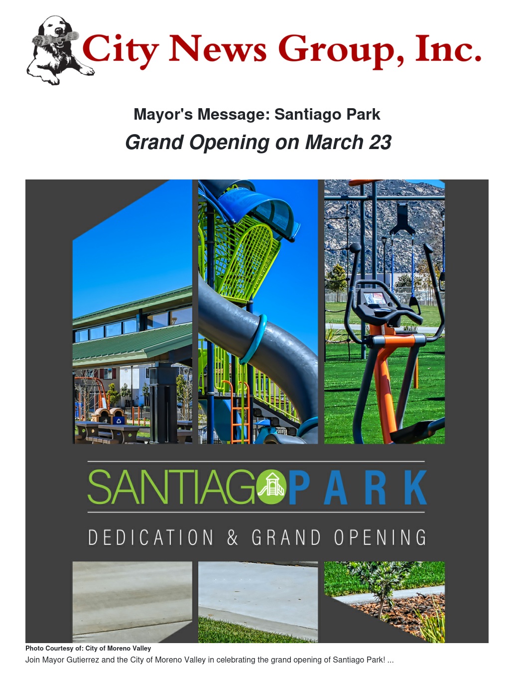 I invite you to join me and the Moreno Valley City Council on Wednesday, March 23 at 2 p.m. as we cut the ribbon and officially open Santiago Park, located at 24731 Tiger Avenue.