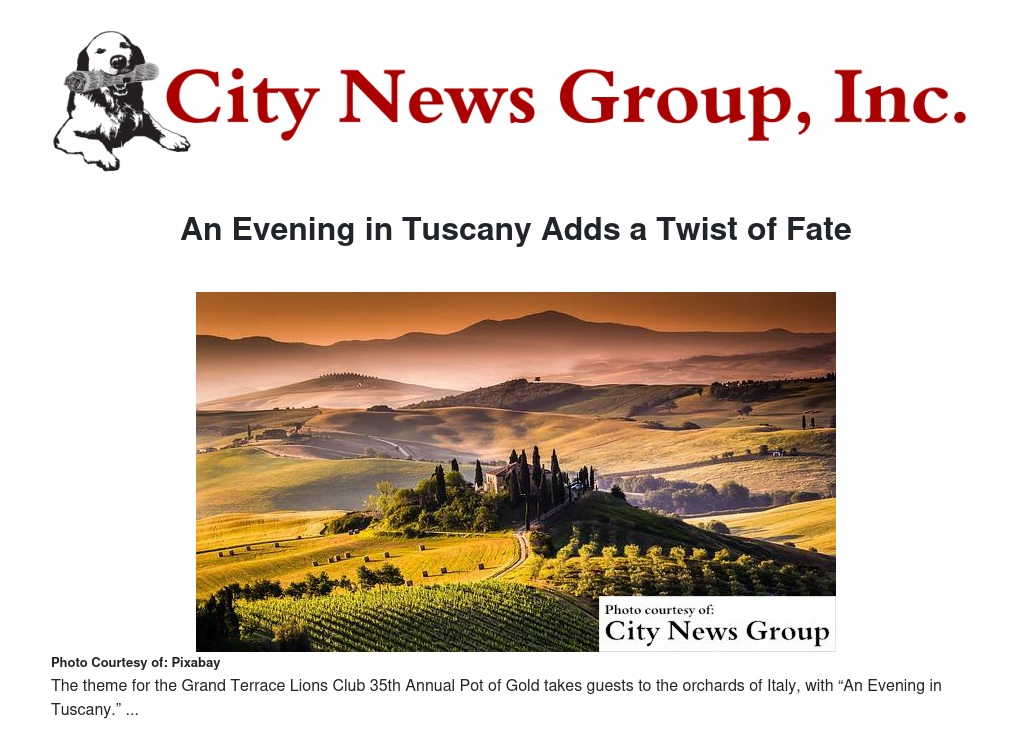 The theme for the Grand Terrace Lions Club 35th Annual Pot of Gold takes guests to the orchards of Italy, with “An Evening in Tuscany.”