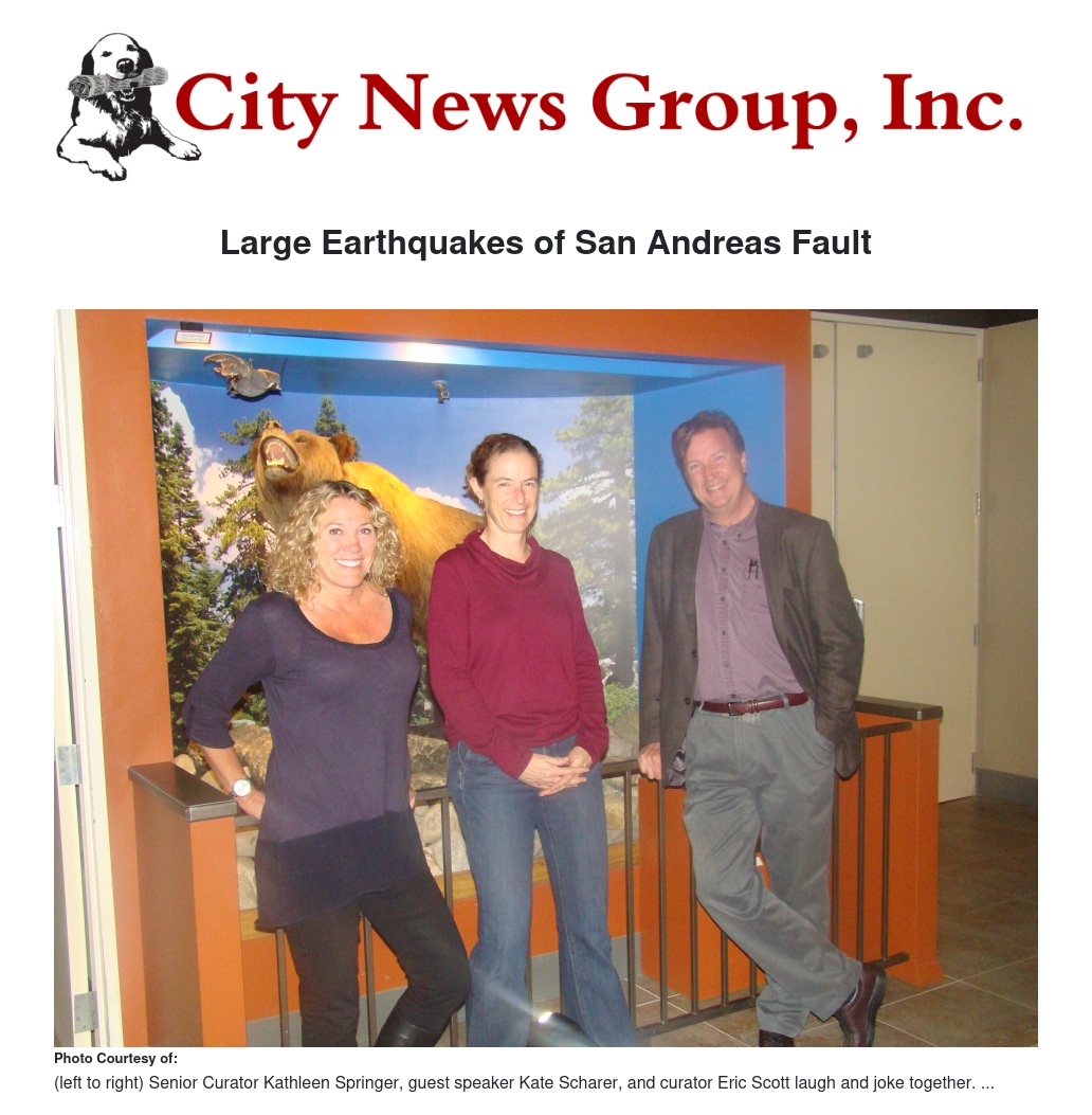 Living in earthquake prone Southern Califonia, we all wonder when "the big one" will hit. This and other questions were the subject at the Frequency of Large Earthquakes on the San Andreas Fault talk at the San Bernardino County Museum (SBCM) as part of the museums guest lecture series. Dr. Kate Scharer of the United States Geological Survey (USGS) was the speaker of the night.