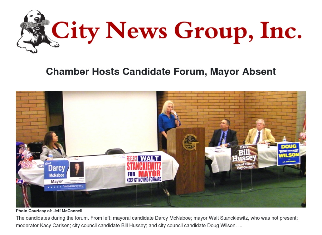 Grand Terrace Chamber Executive Director Sally McGuire claimed via email, “It's unfortunate that the mayor has decided to once again attack the Chamber of Commerce by calling into question the integrity of the entire organization because of one person's (my) support of one exceptional candidate. You need to remember that this mayor boycotted the candidate forum four years ago, in 2010, when he first ran for mayor, and I'm sure he had an excuse then too that was equally unconvincing. The mayor supports and makes time for things he wants to support and attend and makes excuses for things he finds unpleasant. The room was full of busy people who work for a living and by his absence to this important event, he disrespected each and every one of them. This is shameful behavior for a supposed community leader.”