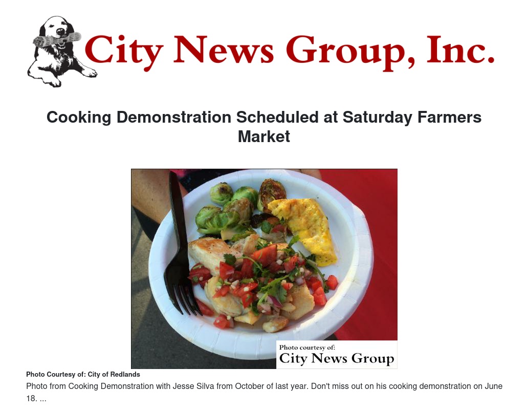 Join the City of Redlands Saturday Morning Farmers Market from 8 to 11 a.m. Saturday, June 18, for the final cooking demonstration with Jesse Silva from Street Tacos Catering. The Saturday Morning Farmers Market is held every Saturday along Redlands Boulevard between Fifth and Sixth streets.