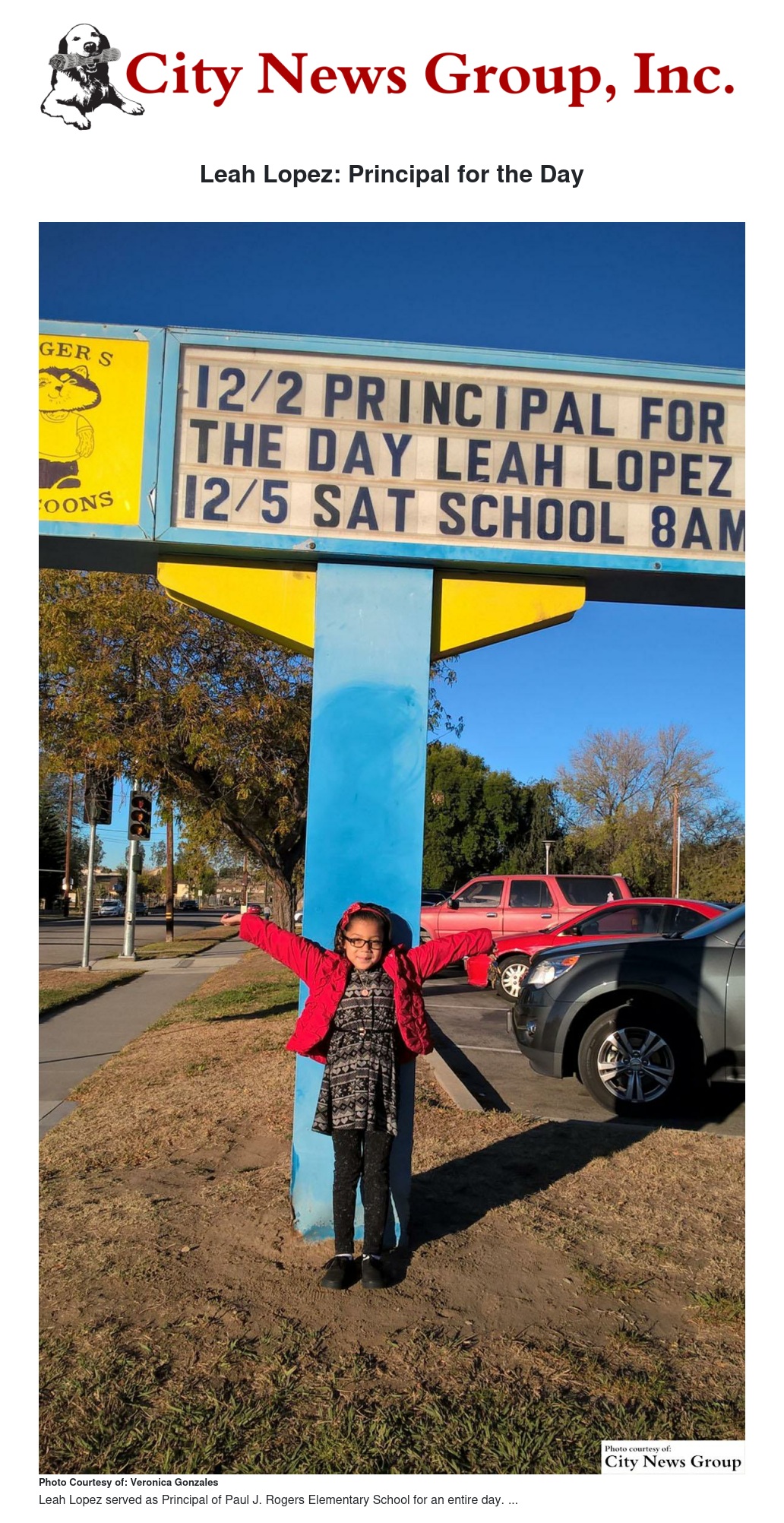 On Wednesday, Dec. 2, second grader Leah Lopez was principal for the day at Paul J. Rogers Elementary.