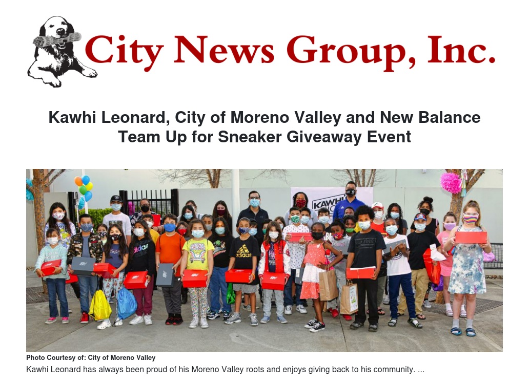Mayor Yxstian Gutierrez, NBA Superstar Kawhi Leonard, Moreno Valley advocate Miesha Slayton, and New Balance teamed up to create Kawhi's Kicks, a special "kicks," also known as, "sneakers" giveaway event. The New Balance shoes handed out were donated to Moreno Valley children enrolled in "A Child’s Place," the City's after-school child care program.
