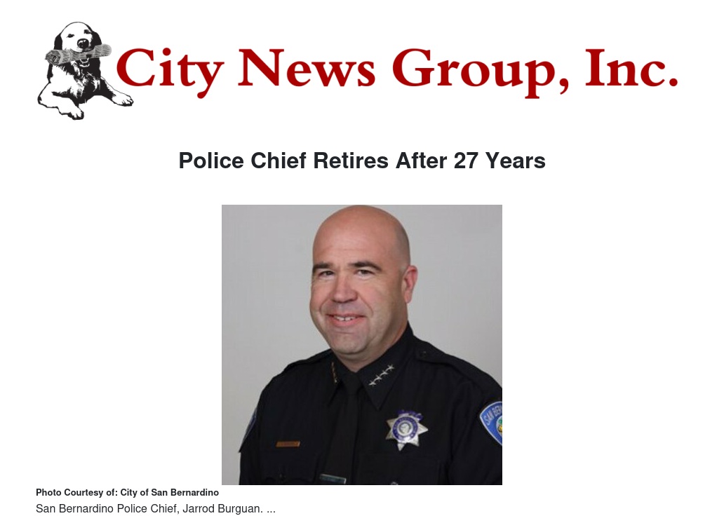Chief Jarrod Burguan has announced his retirement from the San Bernardino Police Department after 27 years of service. Chief Jarrod Burguan has been with the San Bernardino Police Department since January 1992 and has been serving as the City's police chief since December 2013. He is the 35th Police Chief in the history of the San Bernardino Police Department.