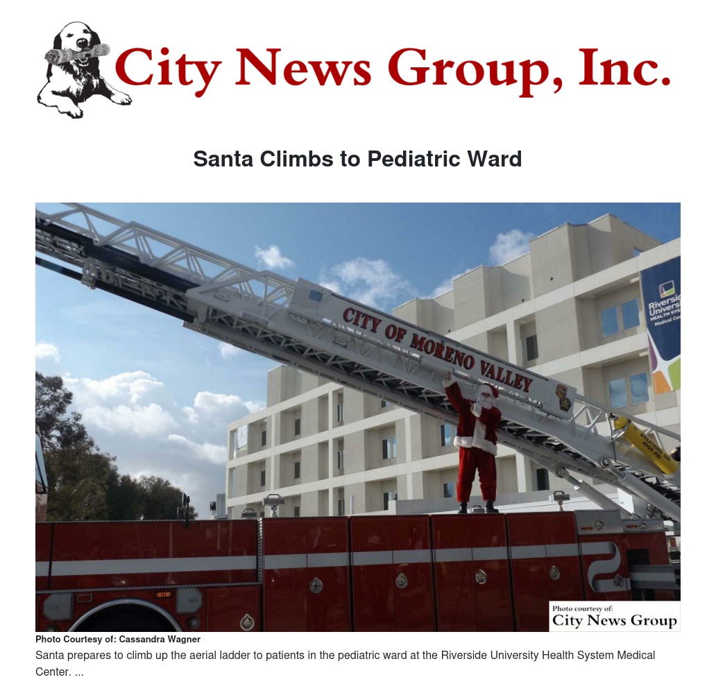 Christmas arrived early on Wednesday, Dec. 23 for children in the Pediatric Ward at the Riverside University Health System Medical Center. Santa Claus made a grand entrance with the assistance of Moreno Valley Fire Department firefighters, by climbing up an aerial ladder to the third floor Pediatric Ward, where he then delivered presents to the patients there.