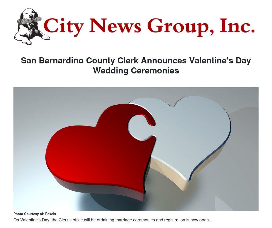 “Valentine’s Day is very popular for marriage ceremonies. The San Bernardino County Clerk’s office stands ready to help deliver great customer service,” said San Bernardino County Assessor-Recorder-Clerk Bob Dutton. “Marriage ceremonies will be conducted all day and I strongly encourage couples to call ahead of time to schedule an appointment.”