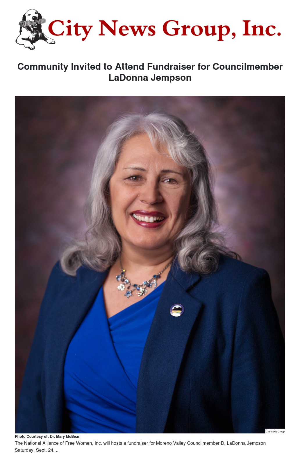 MORENO VALLEY>> The National Alliance of Free Women, Inc. will hosts a fundraiser for Councilmember D. LaDonna Jempson for her re-election campaign bid Saturday, Sept. 24 from 2-4 p.m.