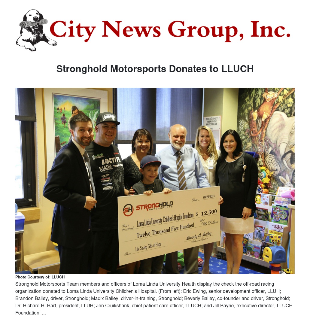 Members of the Stronghold Motorsports Team visited Loma Linda University Children’s Hospital (LLUCH) recently to deliver a check for $12,500 to help pay for treatment of children receiving charity care. “The Stronghold Motorsports Team is driven to excellence and success each and every day; we always know that our next victory is right around the curve,” said Beverly Bailey, who founded the Riverside, Calif.-based team in 2009 with her husband, Scott Bailey. “With this same determination and purpose, we are extremely proud to support Loma Linda University Children’s Hospital with our contribution of $12,500 to help fill gaps in healthcare coverage for children in our community,” she said. In the photo, Stronghold Motorsports Team members and officers of Loma Linda University Health display the check the off-road racing organization donated to Loma Linda University Children’s Hospital. (From left): Eric Ewing, senior development officer, LLUH; Brandon Bailey, driver, Stronghold; Madix Bailey, driver-in-training, Stronghold; Beverly Bailey, co-founder and driver, Stronghold; Dr. Richard H. Hart, president, LLUH; Jen Cruikshank, chief patient care officer, LLUCH; and Jill Payne, executive director, LLUCH Foundation.