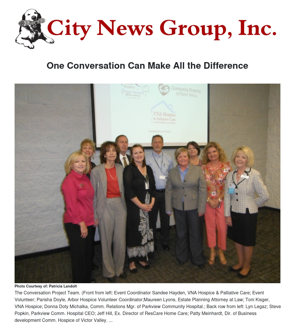 Patty Meinhardt of VNA So. California served as MC as well as speaker for the event. She shared that The Conversation is for any adult. Some of her thought provoking questions, "What is important to you? What do you value most? What can you not imagine living without. Who do you trust to speak to? How long do you want to receive medical care? How involved do you want your loved ones to be?"