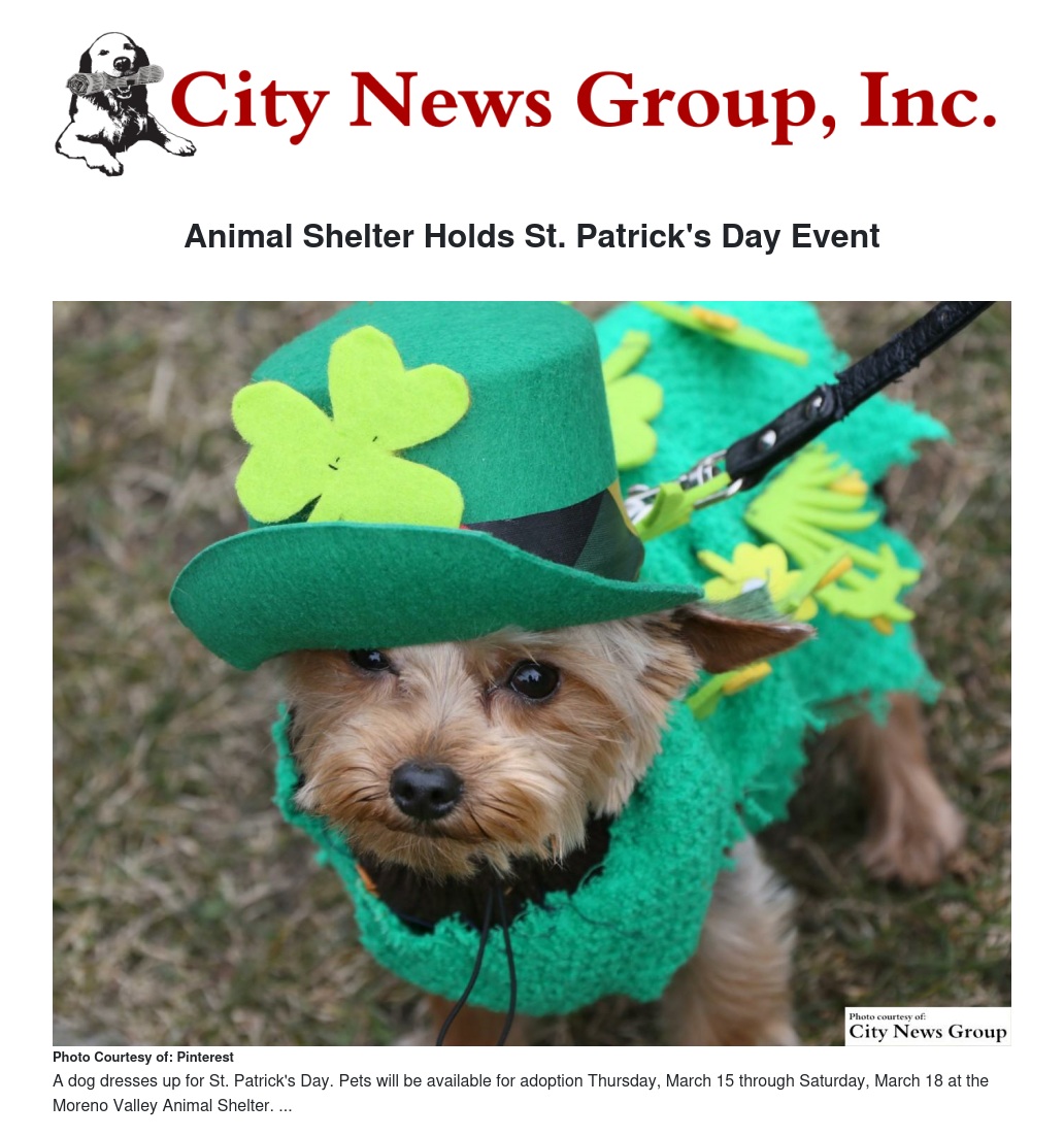 MORENO VALLEY>> In honor of St. Patrick’s Day this Friday, the Moreno Valley Animal Shelter will be hosting a St. Patrick’s Day Pet Adoption event Thursday, March 15 through Saturday, March 18.