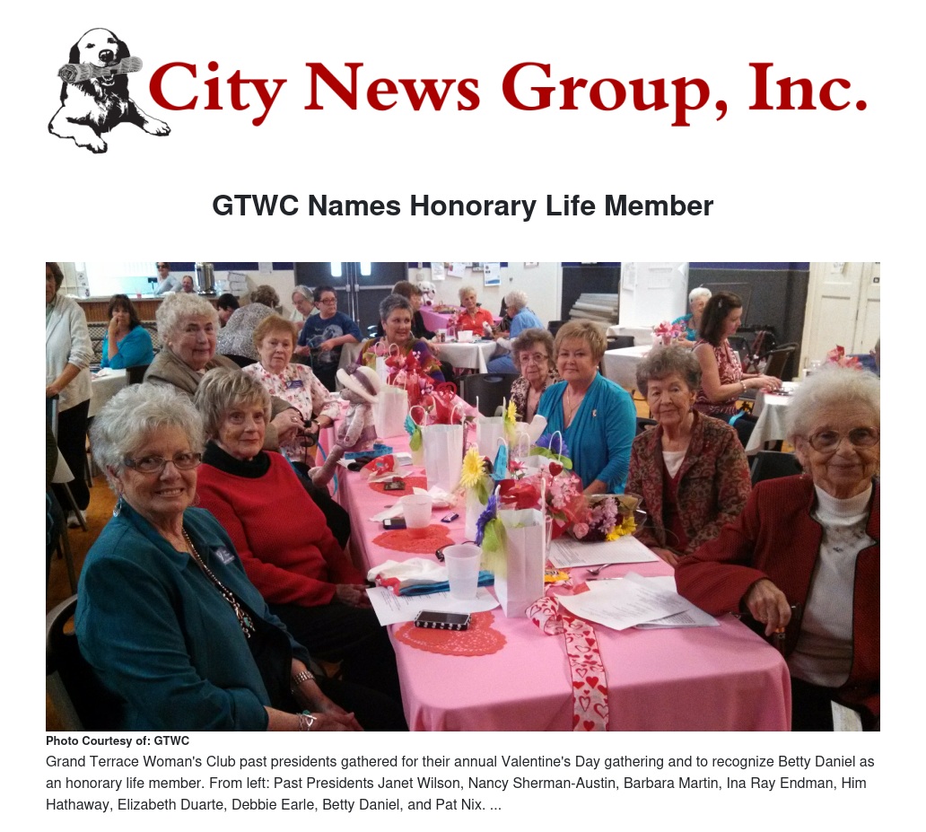 Grand Terrace Woman's Club past presidents gathered for their annual Valentine's Day gathering and to recognize Betty Daniel as an honorary life member. From left: Past Presidents Janet Wilson, Nancy Sherman-Austin, Barbara Martin, Ina Ray Endman, Him Hathaway, Elizabeth Duarte, Debbie Earle, Betty Daniel, and Pat Nix.