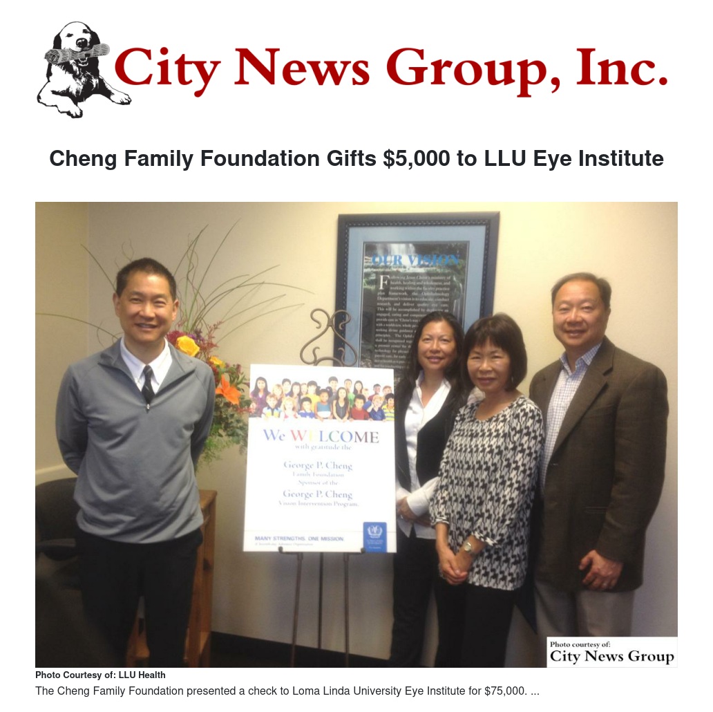 The Loma Linda University Eye Institute has received a gift of $75,000 from the Cheng Family Foundation in honor of George P. Cheng, MD, Loma Linda University School of Medicine alumnus, Class of 1946.
