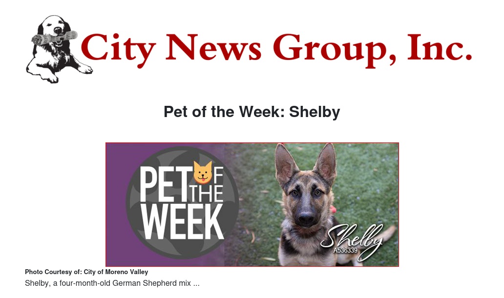 If you would like to make Shelby or any pet from the Moreno Valley Animal Shelter part of your family, please contact the Moreno Valley Animal Shelter at 951.413.3790 or visit www.moval.org/pets
