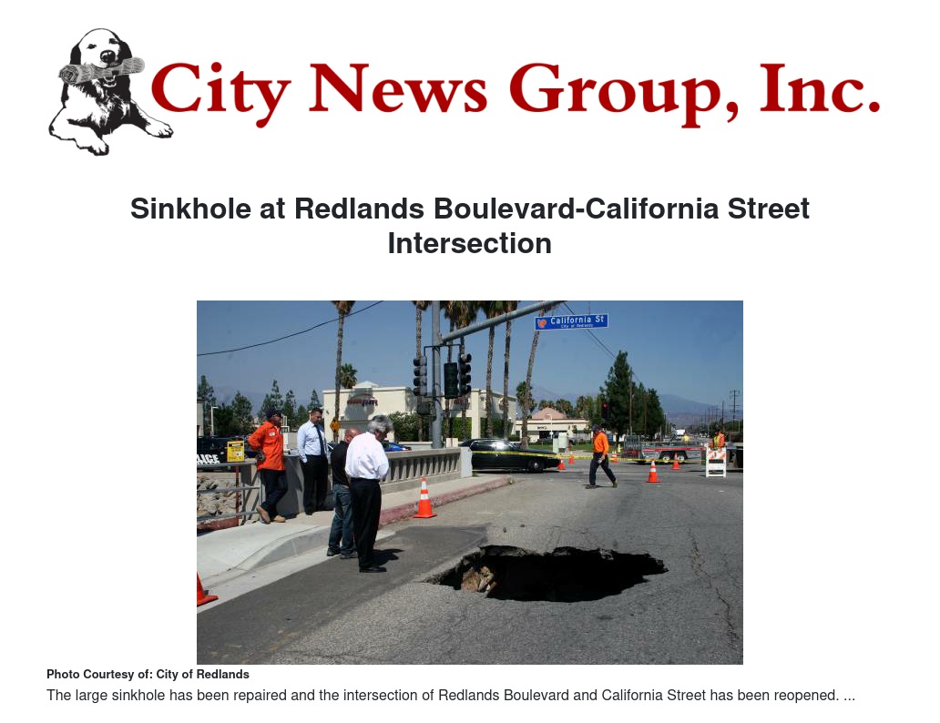 Sinkhole at Redlands Boulevard-California Street Intersection