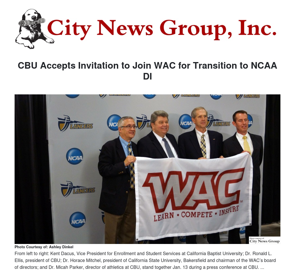 "This represents a great step forward for California Baptist University and Lancer Athletics," said Dr. Ronald L. Ellis, CBU president. "We are honored to join the Western Athletic Conference and to advance CBU to NCAA Division I, the pinnacle of intercollegiate athletics. I am confident that moving to D-I as a member of the WAC will further elevate CBU's reputation for excellence in athletics as well as academics."