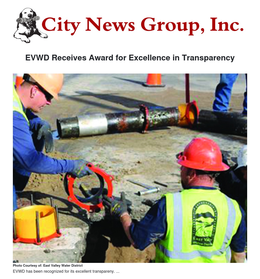 Highland, Calif., (September 24, 2018) – Operating under the principles of transparency as a commitment and responsibility to the community, East Valley Water District has taken steps to make financial reports and other information easily accessible to the public. Through these efforts, the District is proud to announce it has been recognized with the Transparency Certificate of Excellence Award by the Special District Leadership Foundation (SDLF).