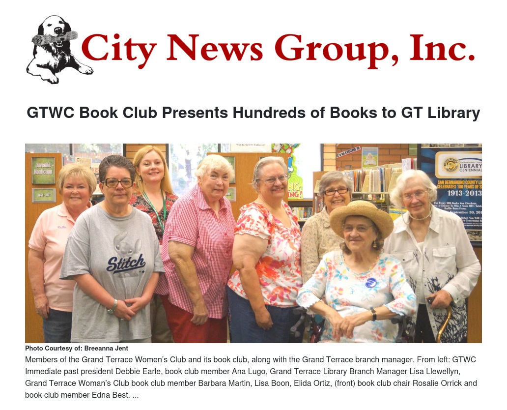 The Thursday Morning Book Club, a section of the Grand Terrace Woman’s Club (GTWC), made its annual presentation of new and gently used books and DVDs on Thursday, Aug. 8, to the Grand Terrace library. This is the group’s sixth annual presentation.