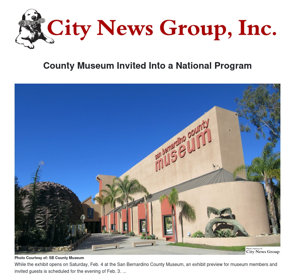 SAN BERNARDINO>> The San Bernardino County Museum has announced that they will join the Bank of America Museums on Us program, the first museum in San Bernardino County to be invited to participate and only the second museum in the Inland Empire since the program launched in 2000.