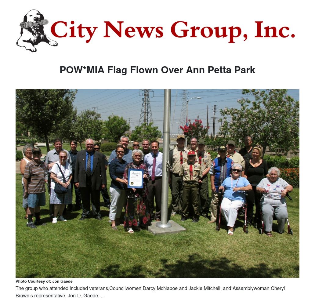 At the Ann Petta Park in Grand Terrace, Boy Scout Troop 40 provided a color guard and raised the American Flag, POW*MIA and California state flags. The Pledge of Allegiance was recited and a prayer was given by Steve Lasiter, Battalion Chief for the San Bernardino County Fire Dept.