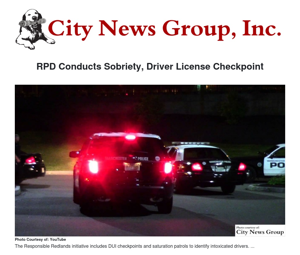 DUI checkpoints are components of the Redlands Police Department’s Responsible Redlands initiative. The Redlands Police Department, with the support of state agencies, including the Department of Alcoholic Beverage Control and Office of Traffic Safety, the County of San Bernardino and local businesses and community groups, launched the initiative in late August 2013 to focus on enforcing alcohol laws.