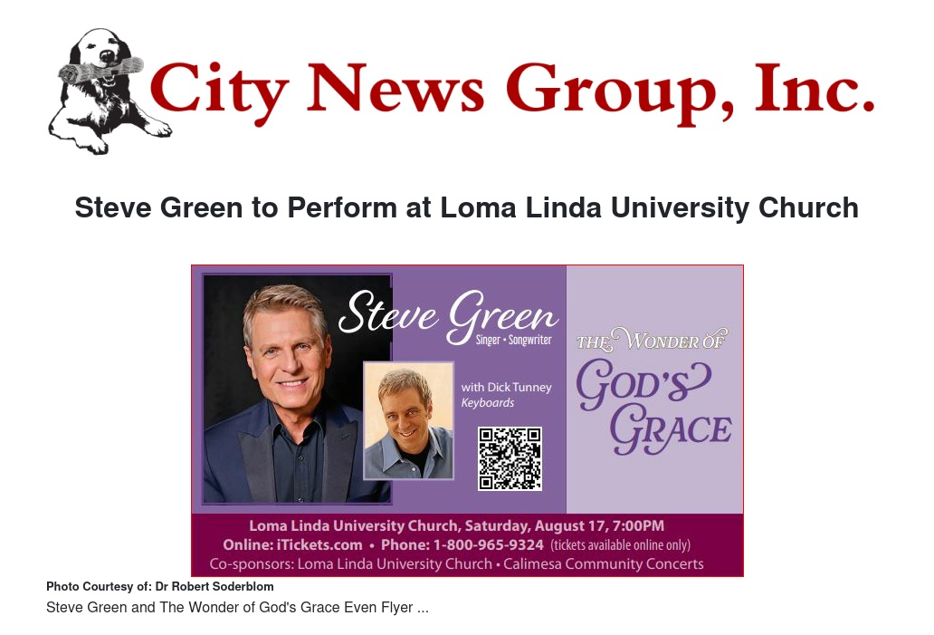Steve Green to Perform at Loma Linda University Church by Ruby Stephenson - City News Group, Inc.