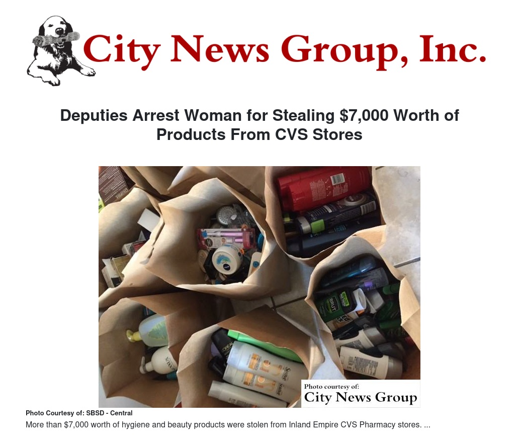 GRAND TERRACE>> On October 28, 2016, Deputy Mitchell from the Central Station responded to a call at the CVS Pharmacy in the City of Grand Terrace involving two females stealing a large amount of cosmetics.