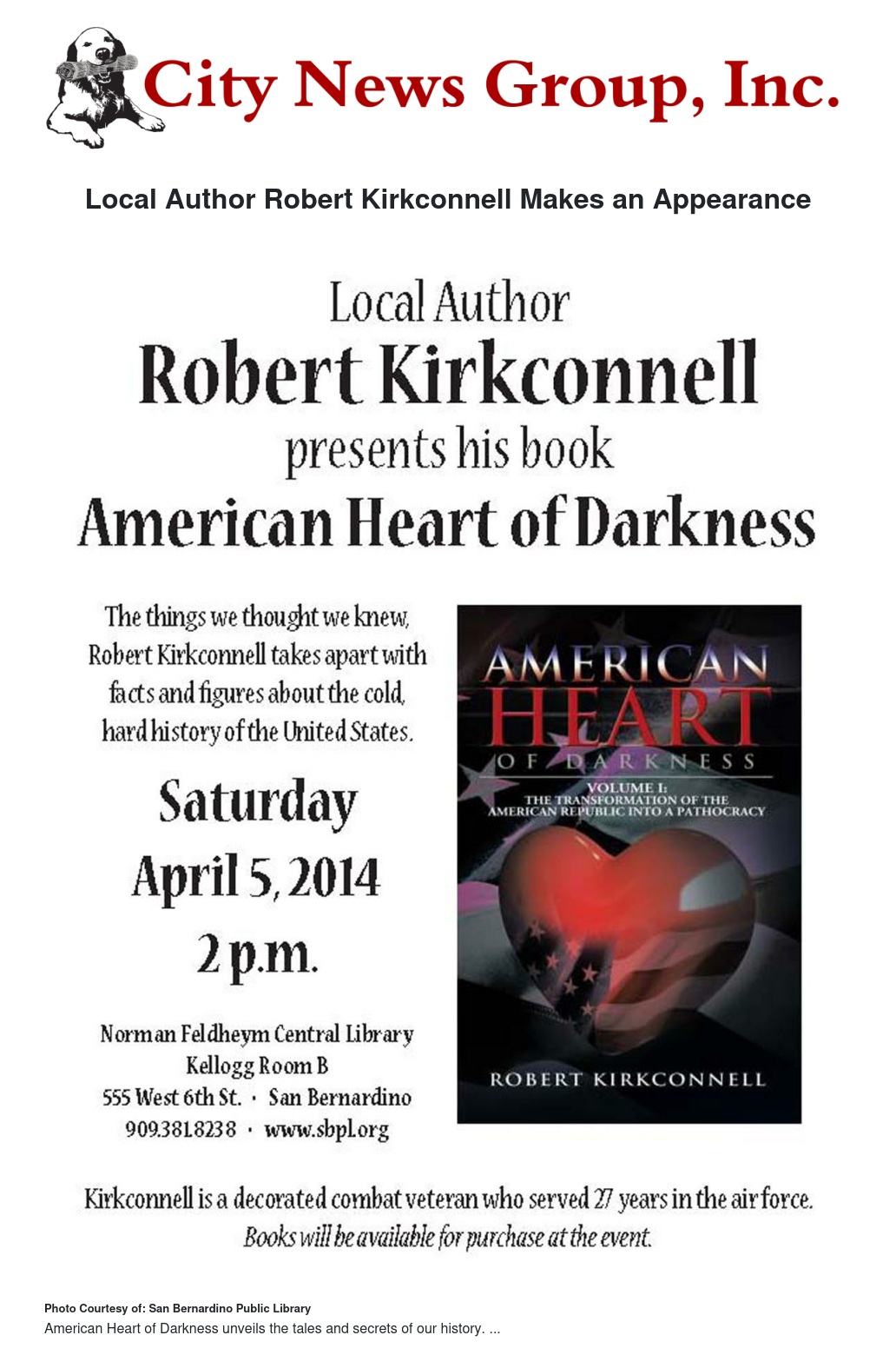 Robert W. Kirkconnell will be discussing his book American Heart of Darkness, at the Feldheym Central Library in Kellogg Room B, at 555 W. Sixth Street in San Bernardino on Saturday April 5th at 2 p.m.