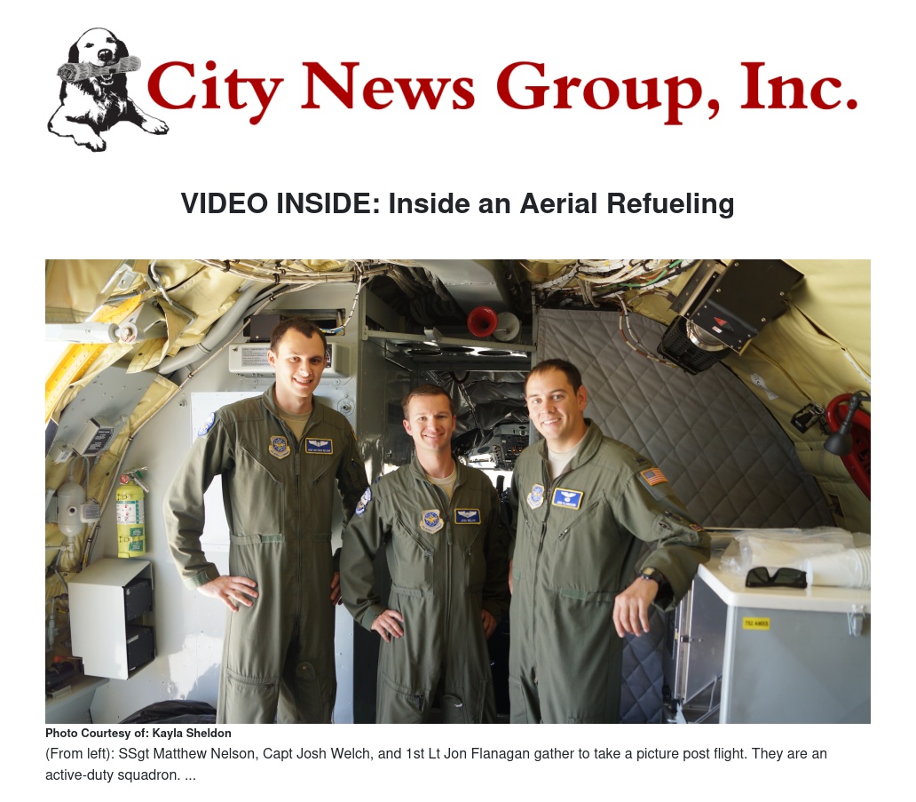 Captain Josh Welch and First Lieutenant Jon Flanagan were the KC-135 pilot and co-pilot during this aerial fueling session and Staff Sergeant Matthew Nelson was the “boom operator” and was either working from his desk in the cockpit or up, walking around the plane throughout the flight.