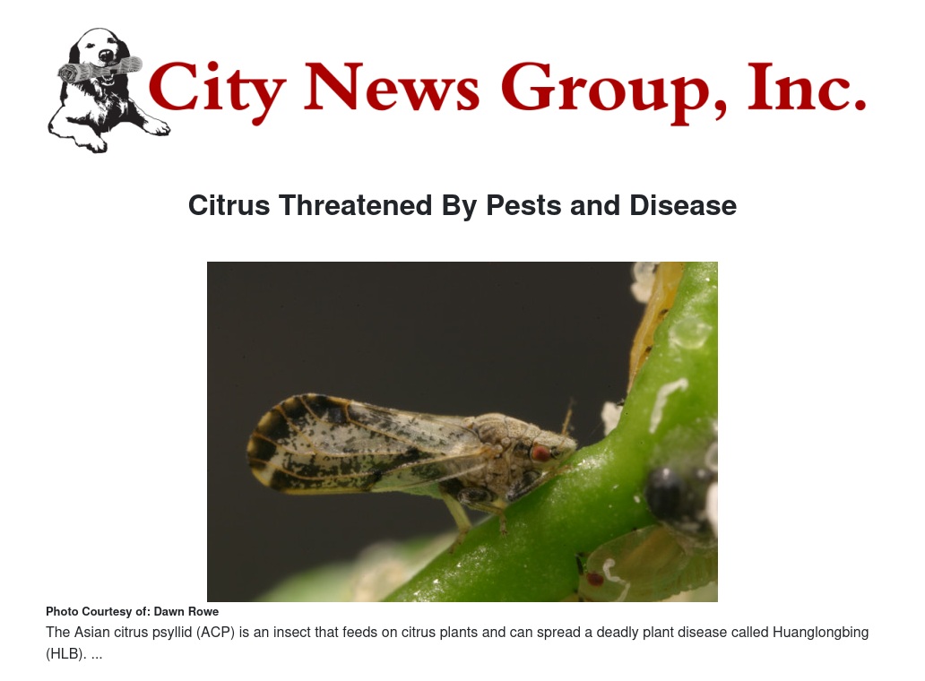 The Asian citrus psyllid (ACP) is an insect that feeds on citrus plants and can spread a deadly plant disease called Huanglongbing (HLB), which has been found in San Bernardino County. While the disease is not harmful to people or pets, once a citrus tree is infected it will die. This disease has had a devastating impact on the citrus industries in Florida and Texas, so this threat to local growers has been monitored closely over the past few years. Recently, populations of ACP were detected near commercial groves in Highland, Mentone, and Redlands, which has resulted in the Proclamation of an Emergency Program from the California Department of Food and Agriculture.