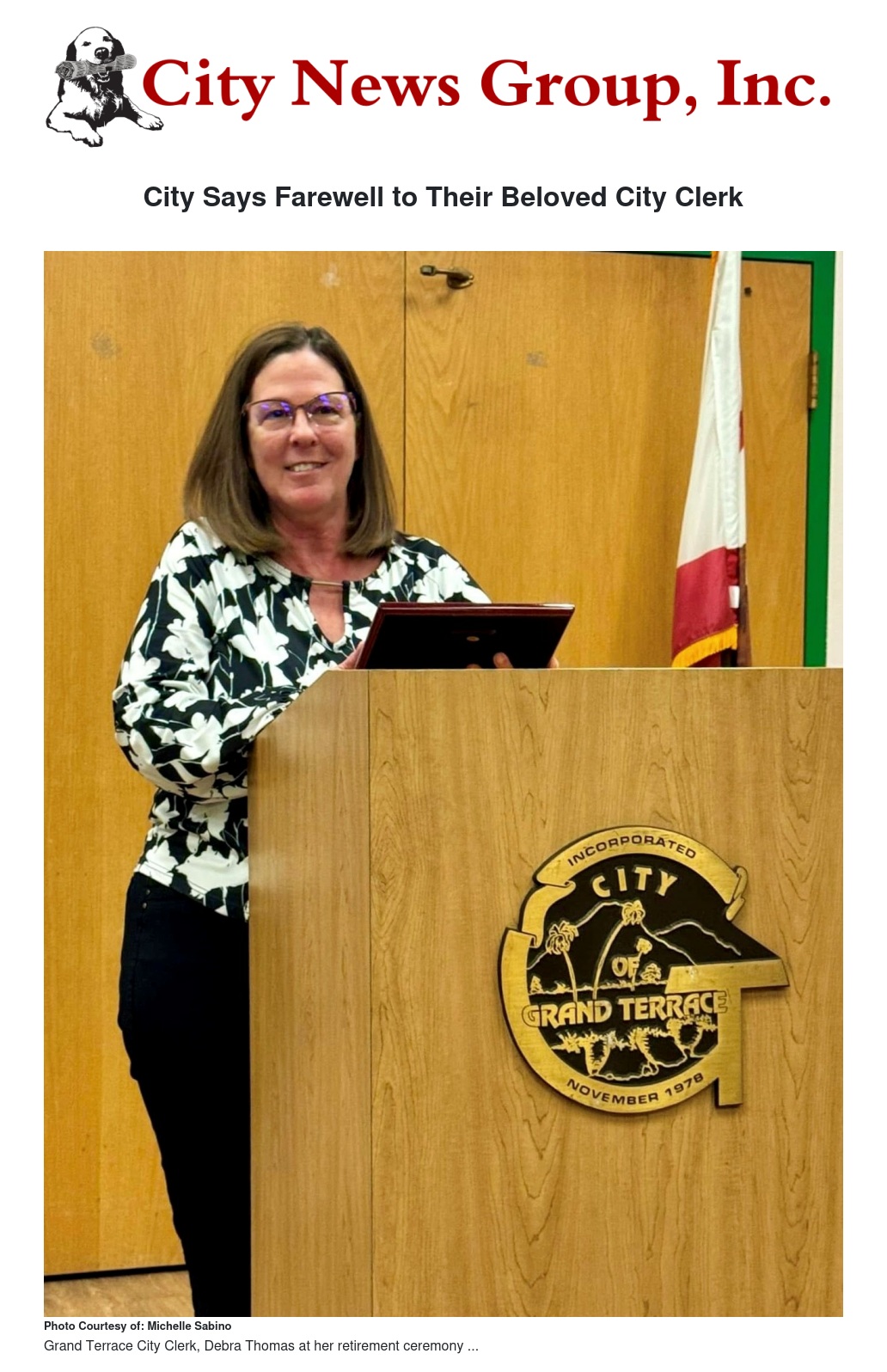 After decades of unwavering commitment and exemplary service, Debra Thomas, the beloved City Clerk of Grand Terrace, has officially retired, marking the end of an era for the city. Debra's tenure has been characterized by her dedication to public service, her meticulous attention to detail, and her genuine passion for the community she served. Over the years, she has played a pivotal role in ensuring the smooth operation of city governance, fostering transparency, and building strong relationships with residents and local officials alike.