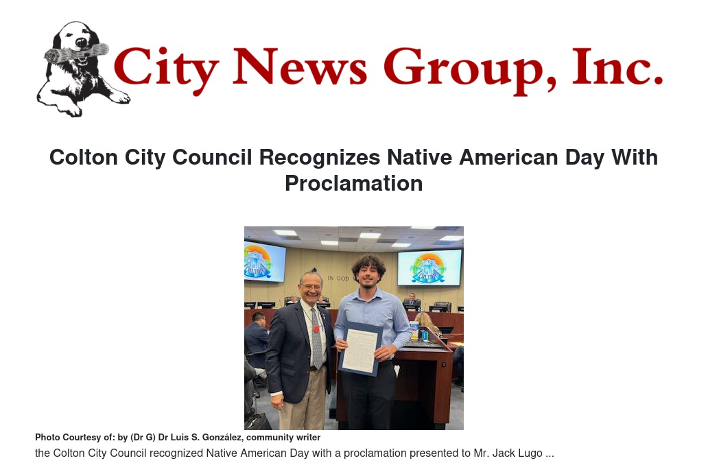 Mr. Lugo attended the council meeting on behalf of Assembly Member James Ramos, who himself is a native American and a member of the San Manuel Band of Mission Indians. “This proclamation is very much appreciated,” said Lugo at the meeting, who continued, “Its important to know that the City of Colton recognizes the contributions of Native Americans to the community.”
