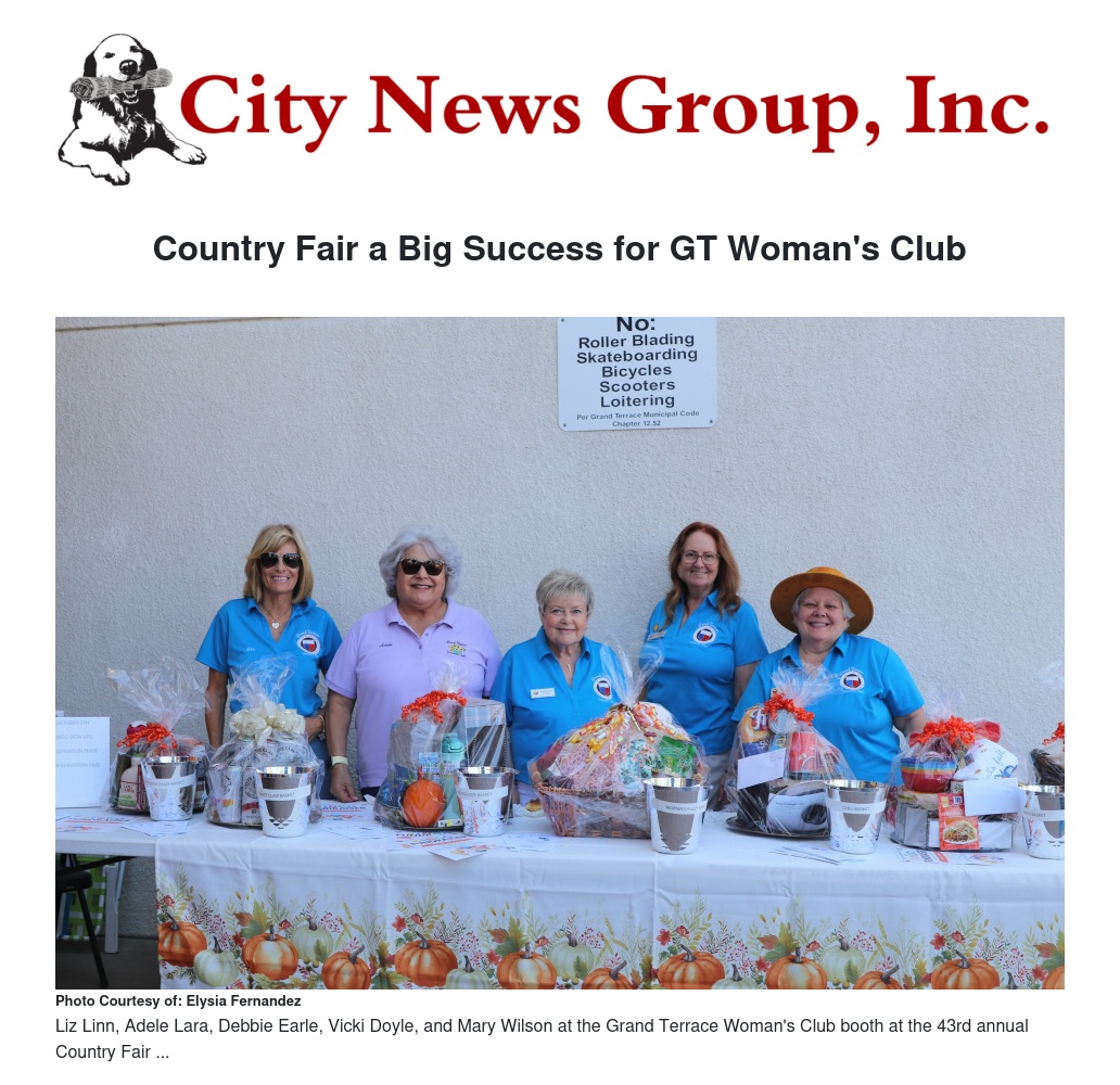 The 43rd Annual Country Fair was a great success for the Grand Terrace Woman's Club and we are looking forward to the upcoming Trunk Or Treat to help fund our program "Christmas For Children", as well as upcoming Bingo events. We will have a booth at Light Up Grand Terrace and will be having some amazing Opportunity baskets for you to buy tickets and take home a prize!! Any businesses that might be interested in becoming a sponsor for our 2nd Annual Silent Auction, please contact Mary Wilson, 3rd V.P. / Fundraising Chair, at 840-228-8880 or email to gtwomansclub@gmail.com